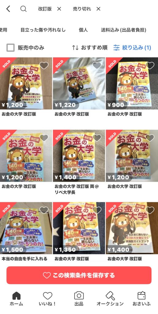先ほどのChatGPT(チャットGPT)で出た参考価格でも出品してもいいですが、もっと厳密にしたい時は、メルカリの「販売済み」フィルターで相場を事前に確認するのが一番確実です。