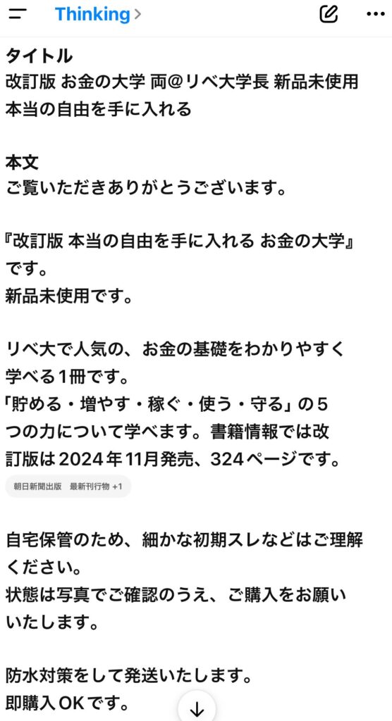 メルカリのAIでも本文は短いので、ChatGPT(チャットGPT)やClaudeチャットで作成する方が便利。