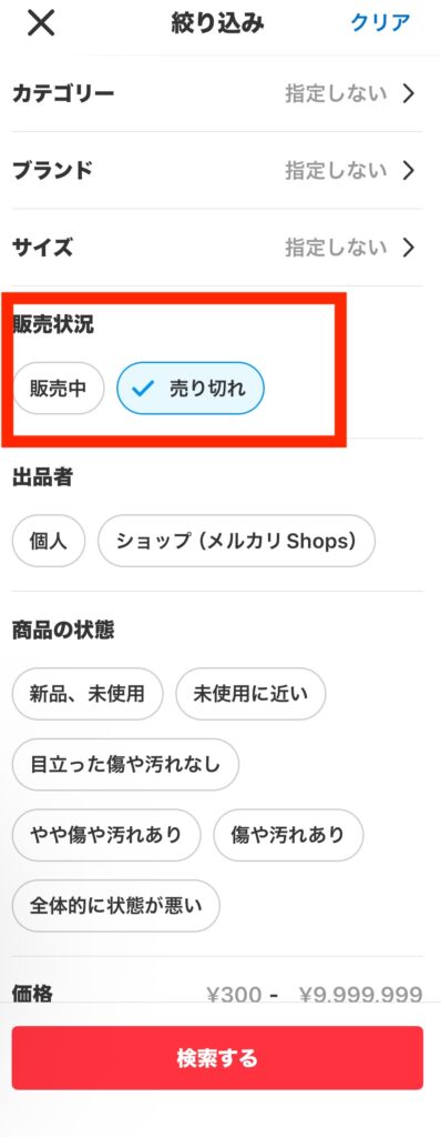 ・絞り込みの中にある販売状況を「売り切れ」に設定