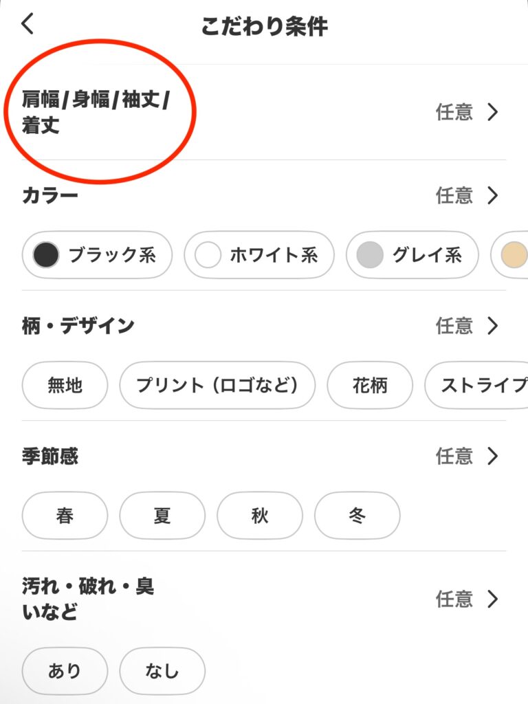①メルカリ出品で服を出品している時に出る、「こだわり条件」をタップ。