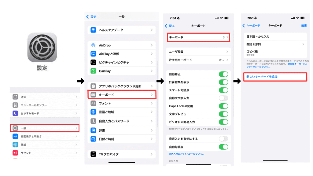 設定アプリ▶︎一般▶︎キーボード▶︎キーボード▶︎新しいキーボードを追加▶︎「コピペ帳」