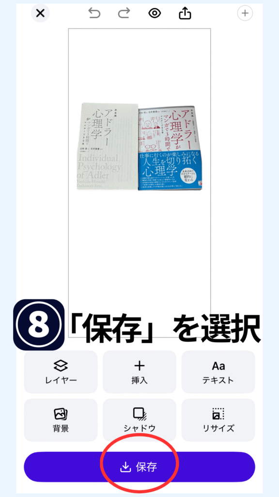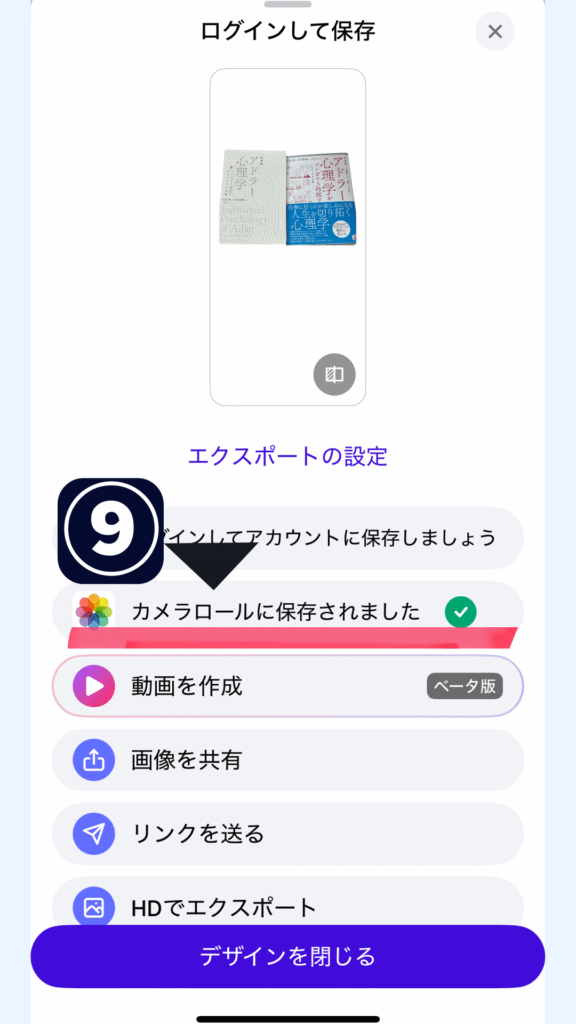 ⑧「保存」ボタンをタップして、カメラロールに保存する
