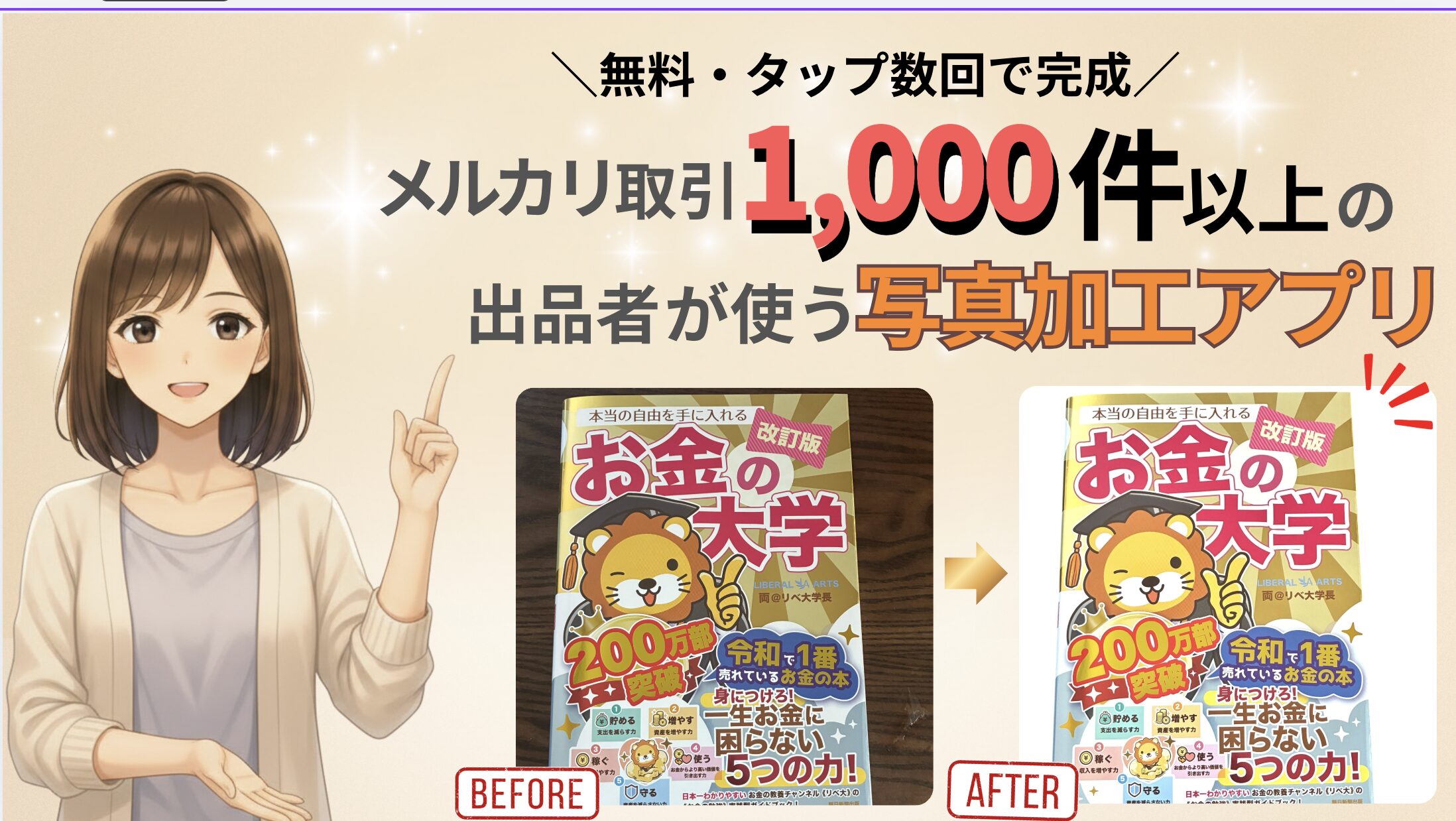 メルカリの出品写真の加工はもちろん、SNSに使う写真の編集にも活用でき、特別なスキルがなくても使えるので初めての方にもぴったりです。