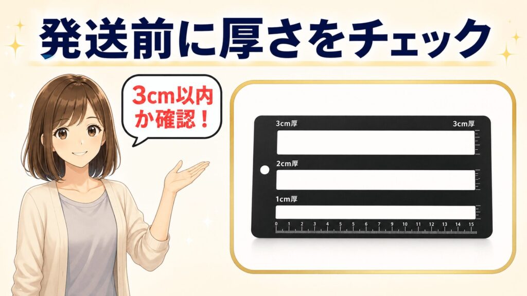 この3cmの壁、うっかりすると簡単に超えてしまいます。重量オーバーより、圧倒的に多いのが「厚みオーバー」での返送です。